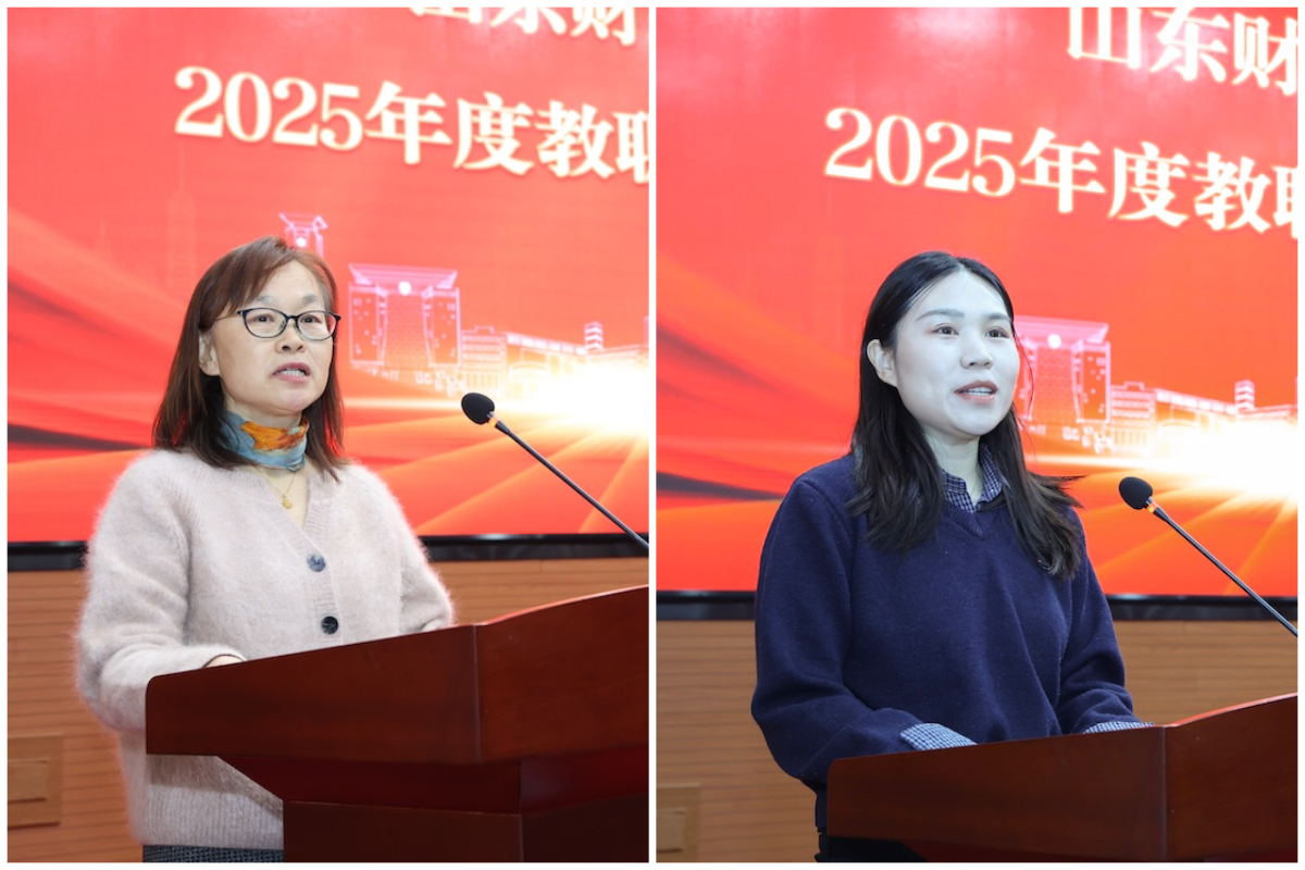 退休教授代表郝秀梅、新进教师代表杜双先后发言。郝秀梅感谢学校以及学院多年的栽培和支持,怀念并肩奋斗、切磋共夜为学校攻克难关的喜悦;她表示今后将继续履行督导职责,一如既往地关心支持学校发展,继续贡献力量,并对学校的未来表达了美好的祝福。杜双从“山财学子”到“山财教师”,深切地理解和感悟了“传承”,她表示将身怀使命与动力,在学校欣欣向荣发展的局面上,以前辈为榜样,传承育人初心,勇担学术使命,深爱共同家园,为学校的高质量发展贡献青春与力量。